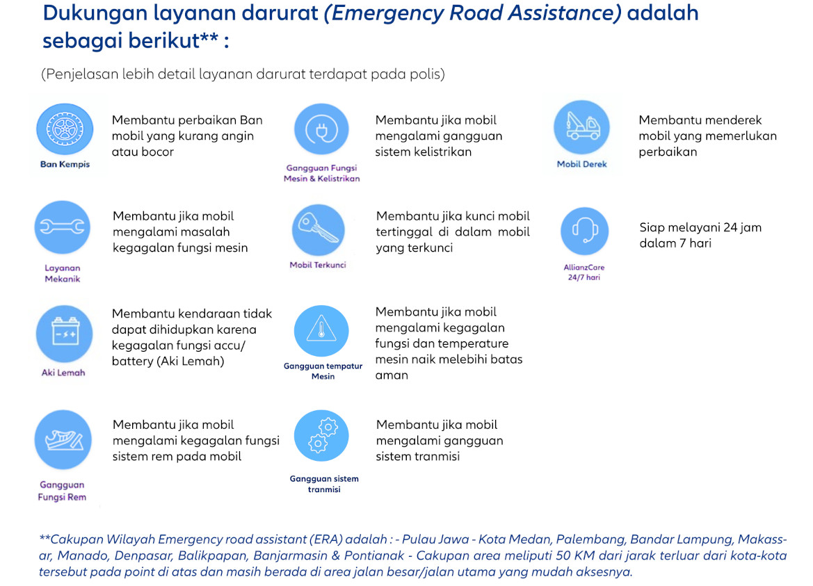 Proses pembelian polis ini mudah dan cepat tanpa proses identifikasi dan appraisal kendaraan di depan. Manfaat transportation allowance: Dilengkapi dengan fitur ERA (Emergency Road Assistance): mogok, ban kempes, atau tangki bahan bakar kosong? Tidak masalah. Tim kami selalu siap membantu kamu melanjutkan perjalanan.